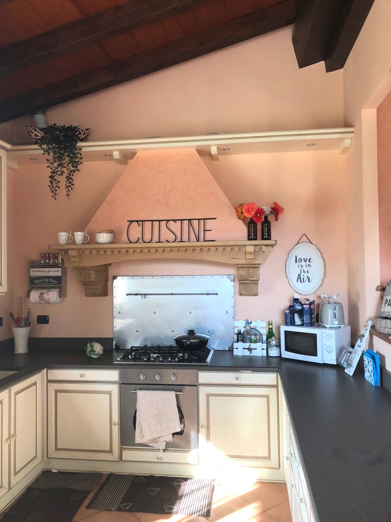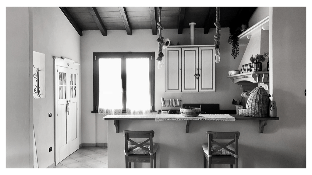 Una parete della cucina è stata parzialmente demolita, al suo posto un muretto nasconde parte dell’arredo e allo stesso tempo funge da isola per i pranzi veloci.